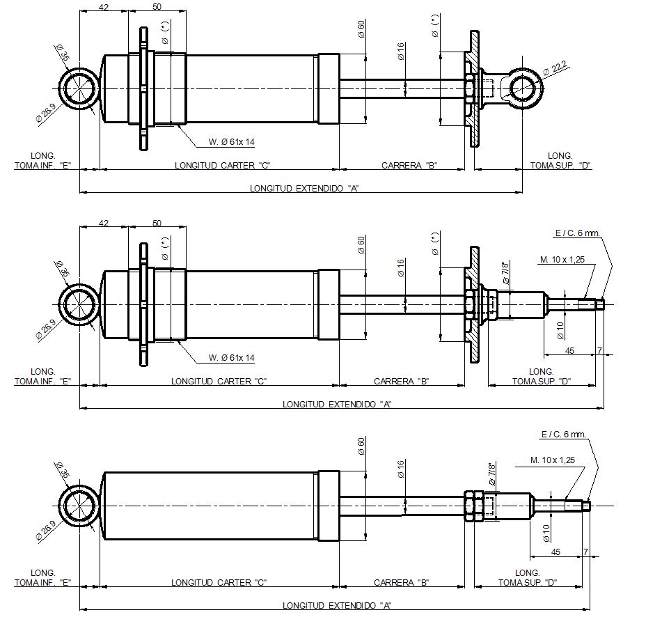 Long. Extendido ‘A’ y Long. toma Sup. ‘D’, corresponde a la opción con toma sup. ojal AMP-124 para utilizar cojinete rotulado (ver accesorios).